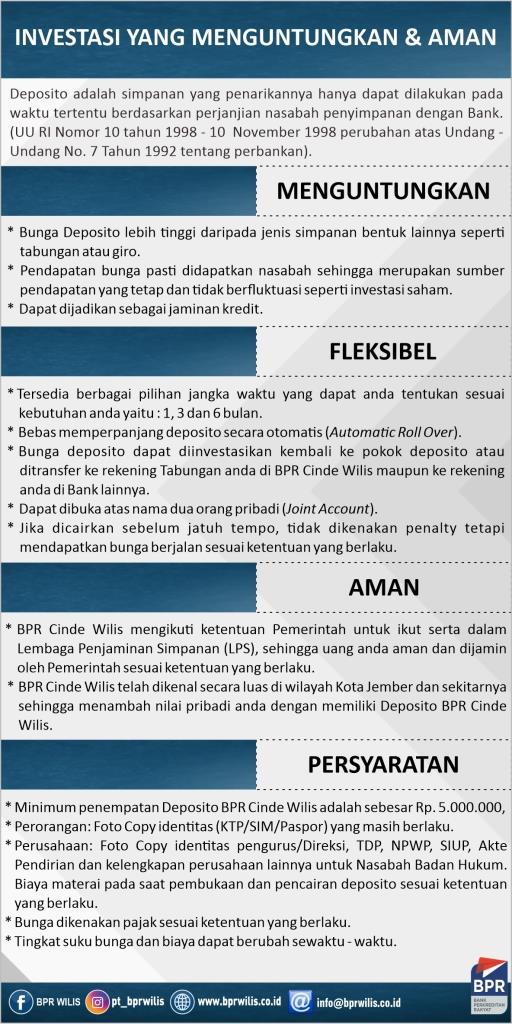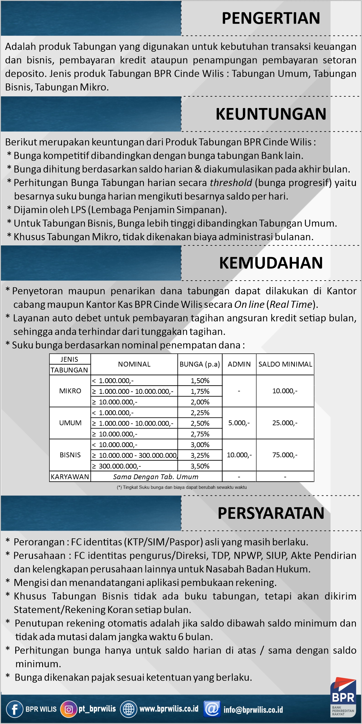 BPR Wilis tidak pernah meminta dana selama proses pemberian informasi produk/layanan ini. Laporkan jika ada keluhan/saran ke :